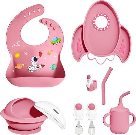 7 Pieces Silicone Baby Feeding Set, Food-Grade Astronaut Theme, Suction Plate and Bowl for Baby, Spoon, Fork, Bib, Cup, Straws,
