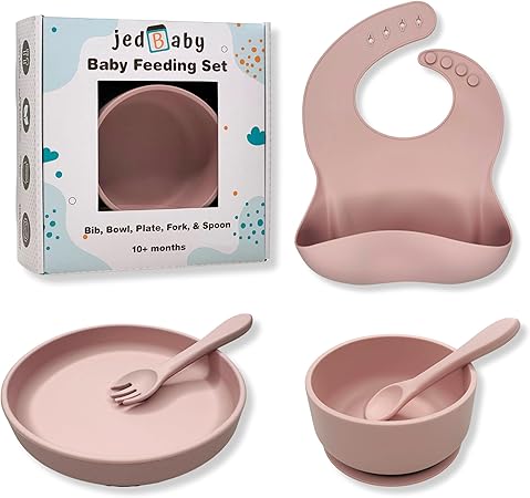 Feeding Set 5pcs (Bib, Plate, Bowl, Fork, Spoon) - Safe, 100% Food Grade Silicone, for Babies & Toddlers 10M+ (Pink)