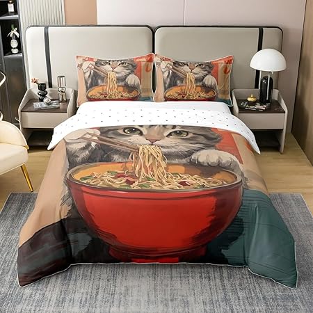 Cat 100% Cotton Bedclothes Twin Size Noodles Bedding Set for Kids Boys Girls Bowl Food Kawaii Cute Kitten Red Grey Comforter