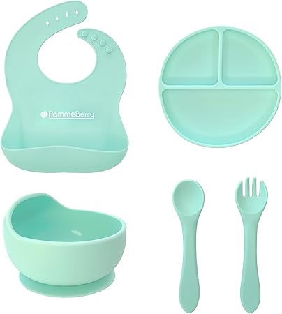 Silicone Baby Feeding Set, Baby Led Weaning Supplies, First Stage Solid Food Eating Utensils, Divided Suction Plate, Bowl, Bibs,
