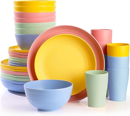 32 pcs Unbreakable Lightweight Wheat Straw Dinnerware Sets for 8, Reusable Kids Plates and Bowls Sets Non Toxic, Microwave and