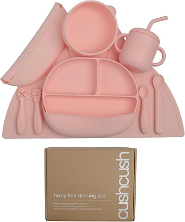 Silicone Baby Feeding Set - 6-12 Months | LED Weaning Supplies - Bib + Plate with Suction + Cup + Bowls and Spoon