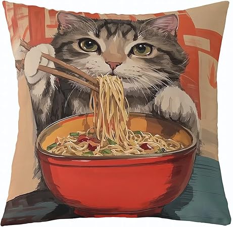 Cat Decorative Square Pillowcase 20x20 Inch Noodles Cushion Cover for Kids Boys Girls Bowl Food Kawaii Cute Kitten Red Grey