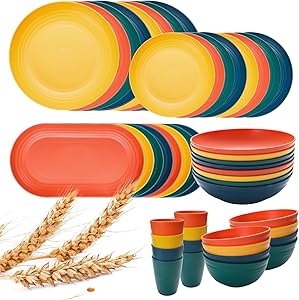 48-Pcs Kitchen Wheat Straw Dinnerware Set, Service for 8, Plastic Reuasble Dinner Dishes Serving Plate Set for Kitchen,
