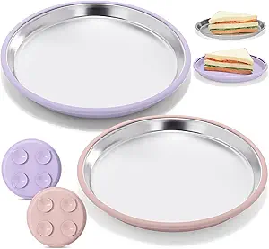 2 Pack 304 Stainless Steel Toddler Plate with Suction 9" Metal Plates with Removable Silicone Shell for Kids Non Slip
