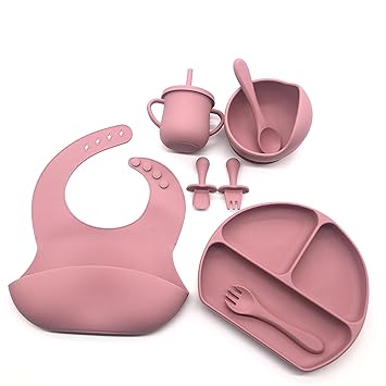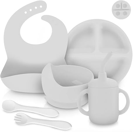 Silicone Feeding Set | Divided Suction Plate,Suction Bowl,Fork, Spoon, Bib, Sippy Straw Cup(light grey)
