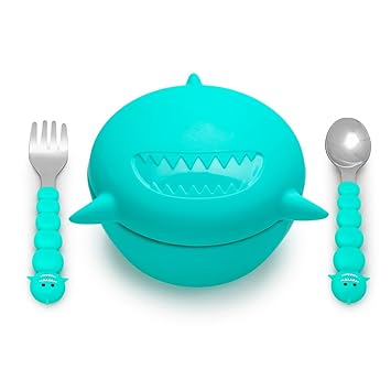 Silicone Bowl with Lid & Utensils – Spoon and Fork for Baby, Toddlers and Kids, BPA Free, Dishwasher & Microwave Safe (Shark)