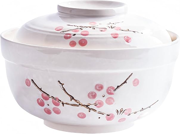 Ceramic Ramen Bowl with lids, Japanese Large 27.5 OZ Big Instant Noodle Bowls for Soup Rice and Porridge (Red Flower)