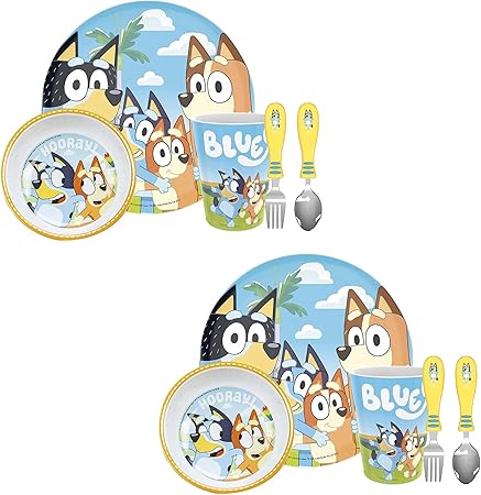 zak! 5-Piece Dinnerware Set, Bluey - Pack of 2 - Durable Plastic & Stainless Steel - Includes Two Each: Tumbler, 8-Inch Plate,