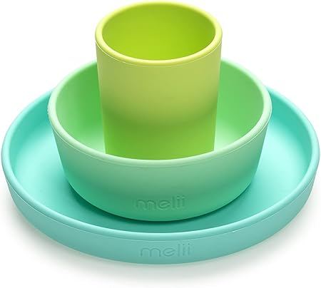 Non-Suction Silicone Plate, Bowl and Cup Set for Toddlers, Kids and Children (Lime, Mint, Blue)