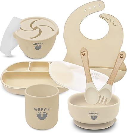 Happy Feet 9 Piece Feeding Supplies, Silicone Baby Led Weaning Set and Dishes, Quality Suction Bowls and Plates (Cream)