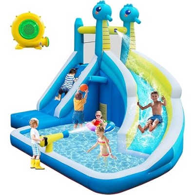 Seahorse Inflatable Water Slide for Kids Backyard | 5-in-1 Blow Up Splash Park with Climbing Wall, WaterSlide, Water Cannon,