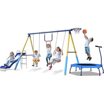 6-in-1 Swing Sets with Slide and 55 Inch Mini Foldable Trampoline for Multiple Children Aged 3-8 Years Old, Bringing Them a