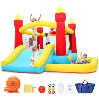 Inflatable Bounce House, Bouncy House with Blower, Bouncy Castle with Slide, Ball Pit, Jump House for Indoor Outdoor Backyard