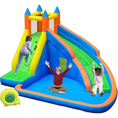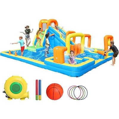 Inflatable Water Slide, Bounce House with 2 Slide for Kids, Inflatable Waterslide Park with Splash Pool, Basketball Hoop, Ball