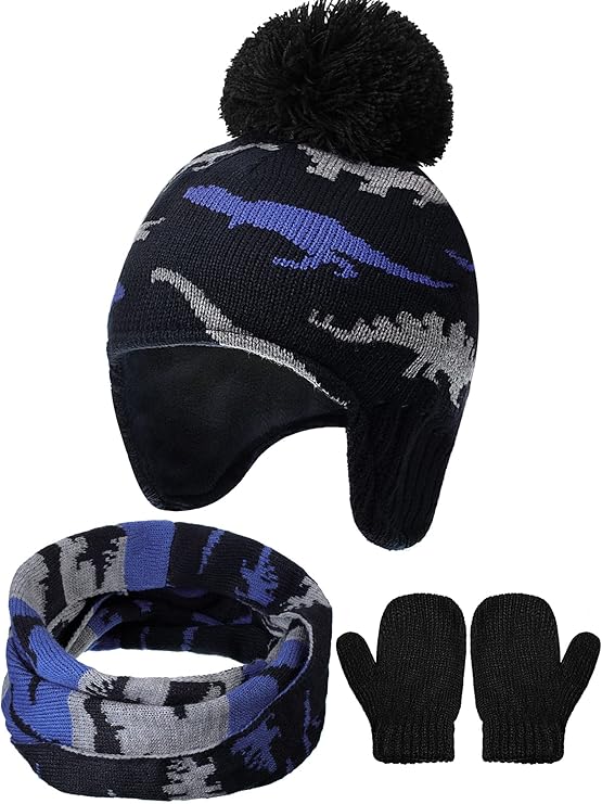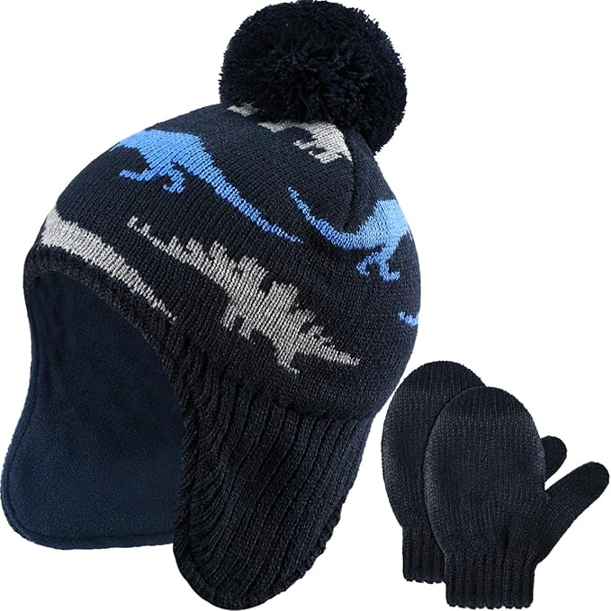 Boys Winter Hat Mitten Gloves Set Toddler Warm Beanie Earflap Baby Knit Fleece Lined Hat