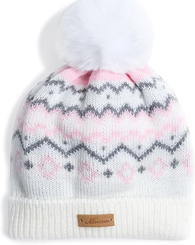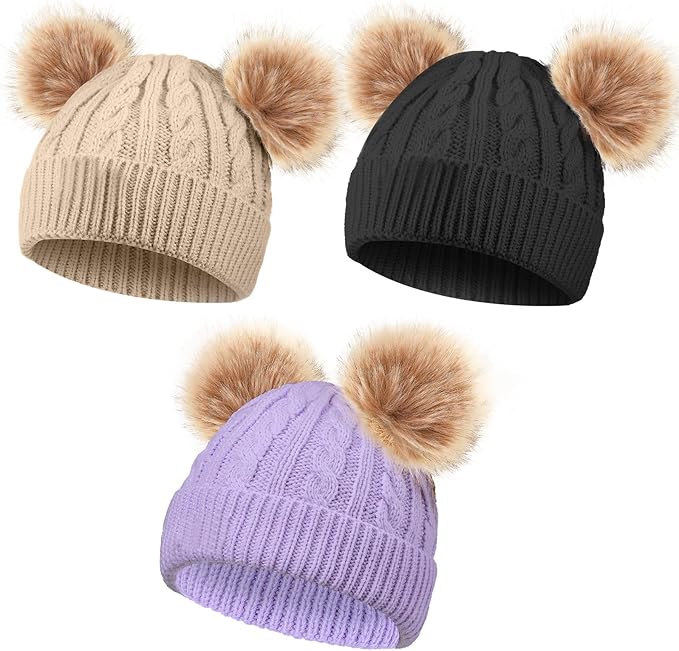 Kids Winter Pompom Hat Knitted Ski Beanie Hat Double Pom Beanie Cap for Girls Boys, for 1-3 Years Old