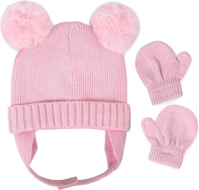 Baby, Toddler Girl Boy Winter Trapper Hat with Chin Strap, Pom Pom Ears, and Mittens Set, 0-12 Months
