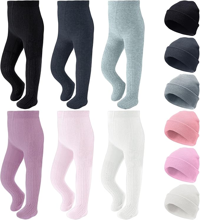 6 Pcs Winter Baby Tights and 6 Pcs Toddler Beanies Hats Kids Cable Knit Leggings for Baby Boys Girls