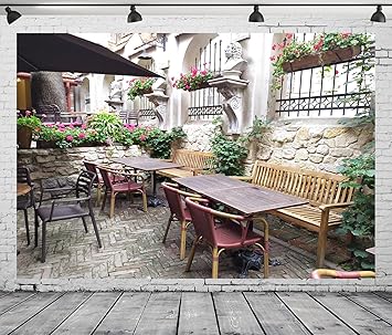 15x8ft Fabric European City Street Backdrop Old Town Streetscape Cafe Restaurant Dining Table Chairs Sofa Leisure Background