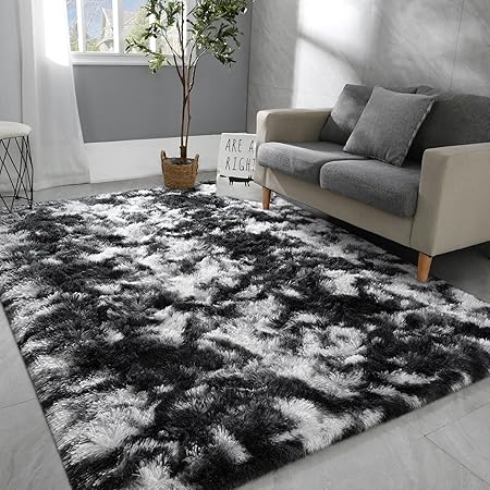 6x9 Large Area Rugs for Living Room, Super Soft Fluffy Modern Bedroom Rug, Tie-Dyed Black White Indoor Shag Fuzzy Carpets for