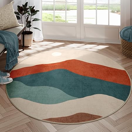 Mountain Round Rugs 6ft, Large Non Slip Circle Rug for Living Room Washable Boho Sunrise Sunset Bedroom Rug, Colorful Stain