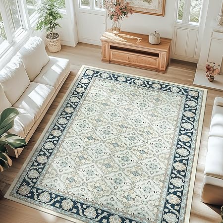 Area Rug 8x10 Living Room Rug - Washable Boho Vintage Floral Low Pile Thin Throw Non-Slip Non-Shedding Carpet for Bedroom,