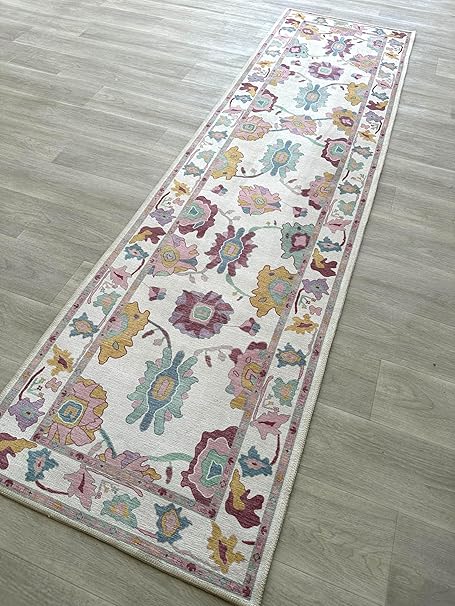 Pink Oushak Runner Rug, Modern Runners, Vintage, Turkish, Eclectic, Floral, Pastel, Washable, Runner for Hallway, Kitchen,