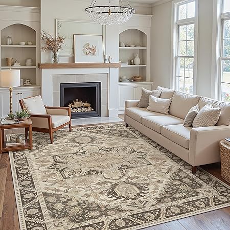 -Washable Area Rugs 6x9-Boho Khaki Rugs for Living Room Machine Washable-3D Rugs for Bedroom-Non Slip Floor Rug-Moroccan